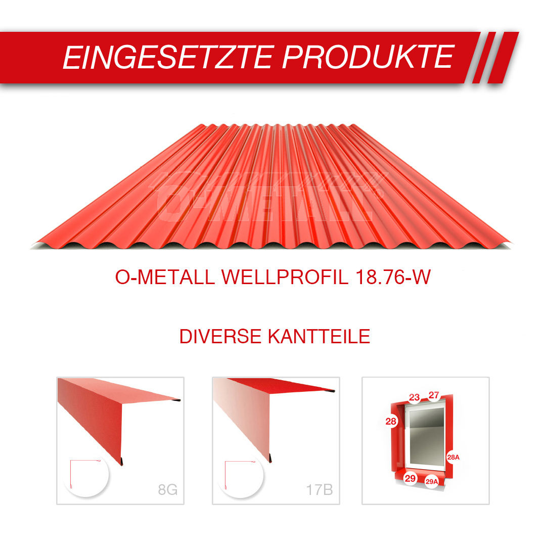 Wellprofile sind nach wie vor eine beliebte Profilgeometrie. Sie gelten als eine klassische Eindeckung, sind wirtschaftlich und einfach zu verlegen. Dass ein Wellprofil aber durchaus auch attraktiv, modern und elegant wirken kann, beweist Ihnen unser Kundenbild. Hier wurde das Wellprofil 18.76-W in RAL 9007 als Fassadenverkleidung eingesetzt. Die Wellenform, Wellengröße sowie die Farbkombination vom Silber des Profils mit den roten Kantteilen als Farbakzent wirkt sehr edel und verleiht dem Gebäude eine hochwertige, moderne Optik.