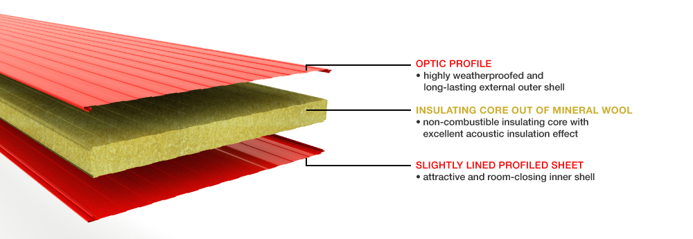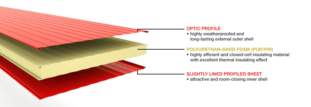 See below examples showing the 3-in-1 principle of sandwich panels for roof and wall: