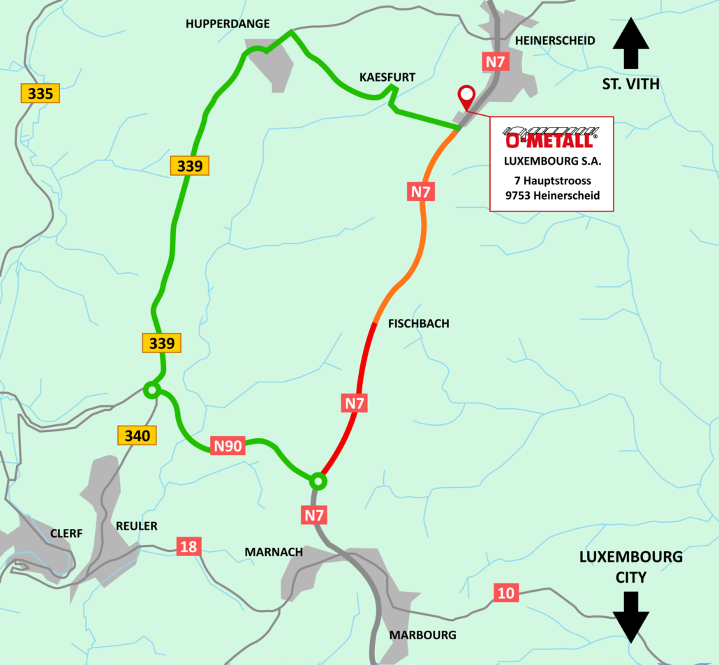 🔹 Of kies de iets kortere route vanaf de rotonde in Marnach – rij via de N90, sla vervolgens af naar de CR339 richting Hupperdange en bereik O-METALL Heinerscheid via Kaesfurt.