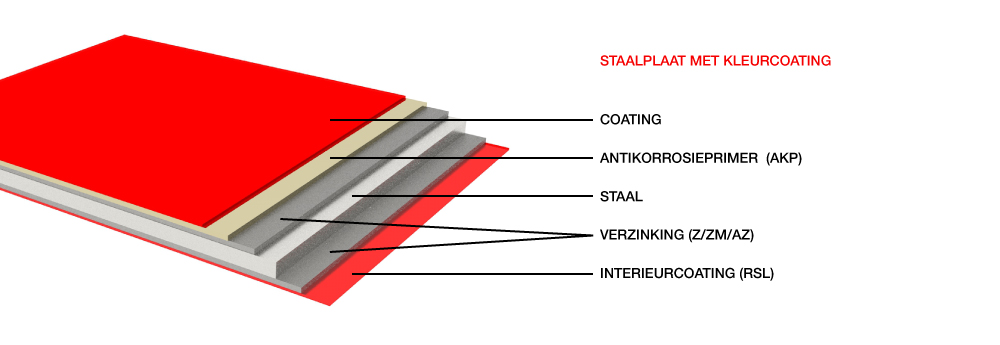 De meeste van onze producten zijn gemaakt van volledig gegalvaniseerd plaatstaal dat is geprimered met een anticorrosielak, die vervolgens van een kleurlaag wordt voorzien. Het type en de laagdikte van de kleurcoating zijn afhankelijk van de eisen van het eindproduct. Zo zijn er speciale coatings voor verschillende eisen en factoren zoals de omgeving (b.v. gebouwen aan de kust of offshore), het gebruik van het gebouw (b.v. landbouwgebouwen), alsmede het uiterlijk en het ontwerp. Tegelijkertijd bieden wij ook een standaardcoating met een uitstekende prijs-kwaliteitverhouding. Deze standaardcoating is een uiterst duurzame en toch kosteneffectieve polyester kleurcoating in alle gangbare RAL-kleuren. Andere coatings zijn bijvoorbeeld gebaseerd op polyurethaan of polyvinylhars, met laagdiktes tot 200µm.